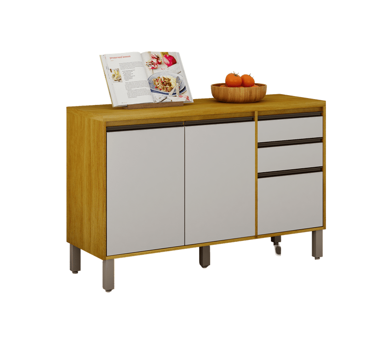 Balcão com 3 portas, 2 gavetas com corrediças telescópicas e divisor de talheres. Possui tampo resistente de 24mm e pés com regulagem para melhor nivelamento. Ideal para garantir organização e praticidade na cozinha.