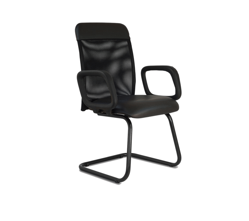 - Base fixa tipo “S” em aço tubular redondo com pintura texturizada preta e sapatas deslizantes.