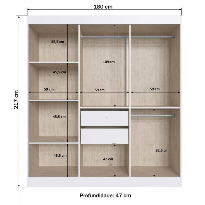 Amplo Espaço Interno: Com seis portas e duas gavetas, oferece espaço de sobra para manter suas roupas e acessórios bem organizados. Conta ainda com quatro prateleiras e três cabideiros, otimizando o armazenamento.