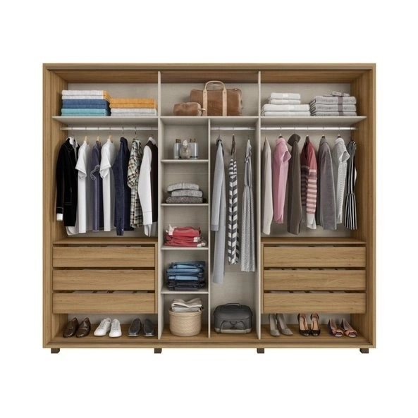 O Guarda-Roupa Supremo é um produto espaçoso pensado para o armazenamento de uma maneira funcional e prática, para isto ele conta com 3 portas deslizantes, sendo que as portas laterais possuem peças ripadas, enquanto a porta central possui um espelho inteiro com puxador do tipo gola e perfis antiempeno em metal com acabamento bronze em todas as portas, que complementam os trilhos em alumínio com o mesmo acabamento. Garantindo maior flexibilidade, as portas possuem pintura dupla face, assim você escolhe a cor na hora da montagem. Além disso este produto conta com 6 gavetas internas com corrediças telescópicas.