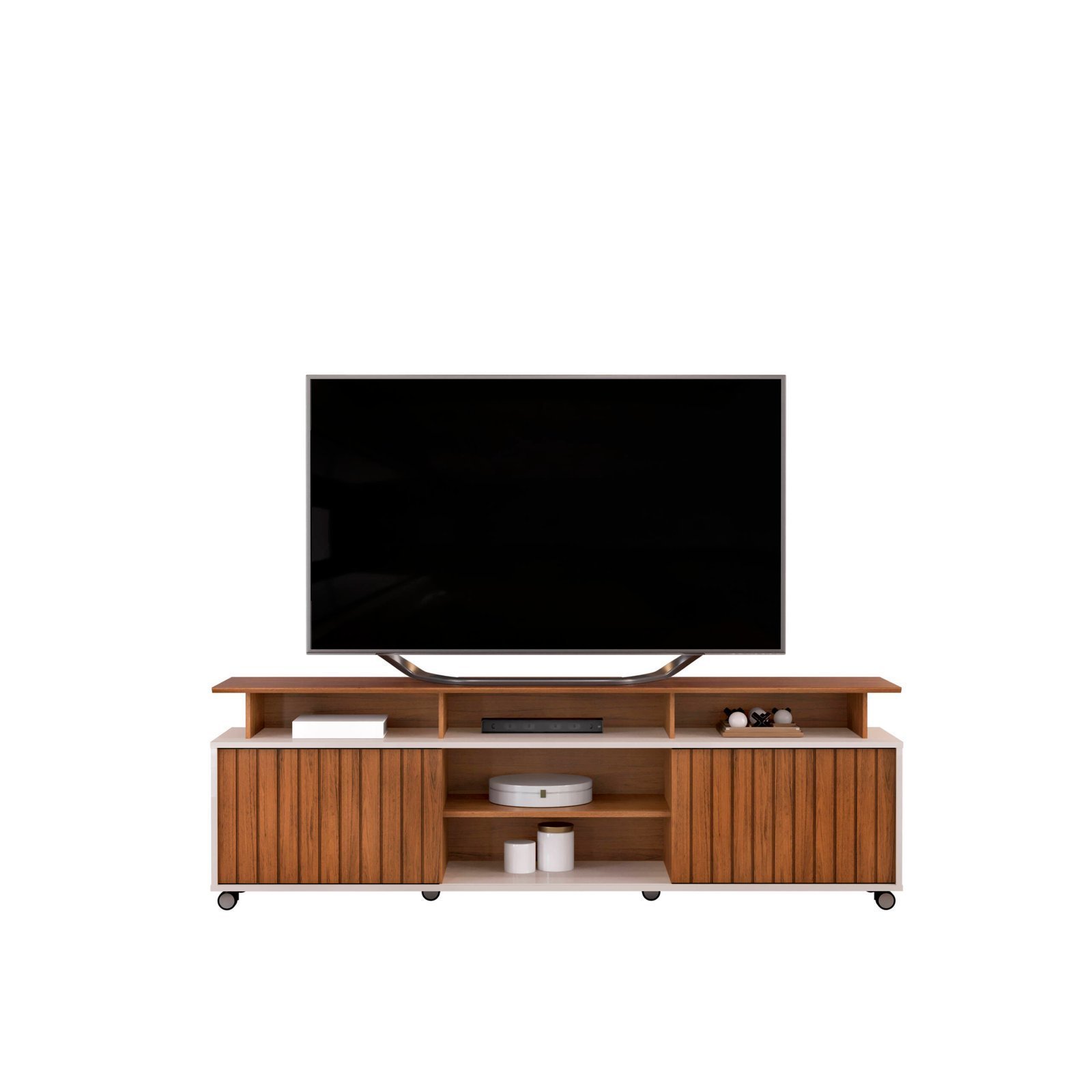Amplo Armazenamento: O Rack Olimpic oferece amplo espaço para armazenamento e organização. Suas duas portas deslizantes com frisos decorativos unem funcionalidade e estética, enquanto três nichos abaixo do tampo proporcionam espaço extra para dispositivos e objetos pessoais.